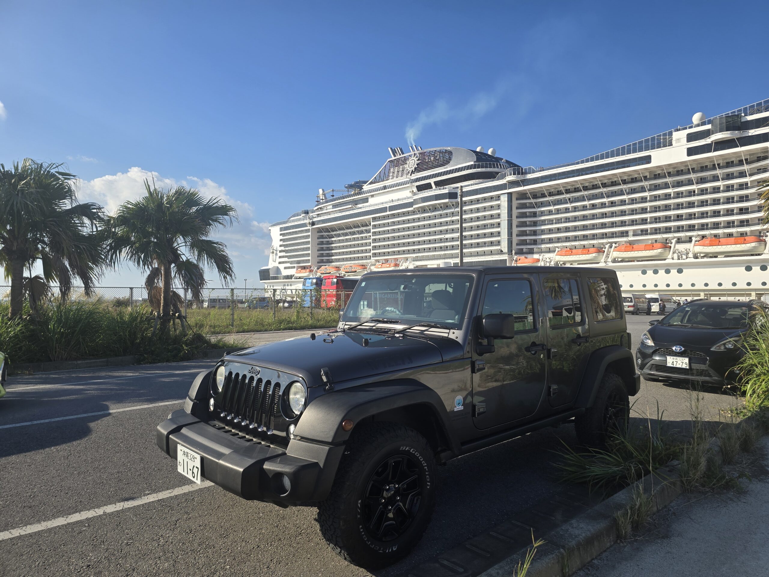 クルーズ船の圧倒的スケール × ラングラーの無骨な存在感。